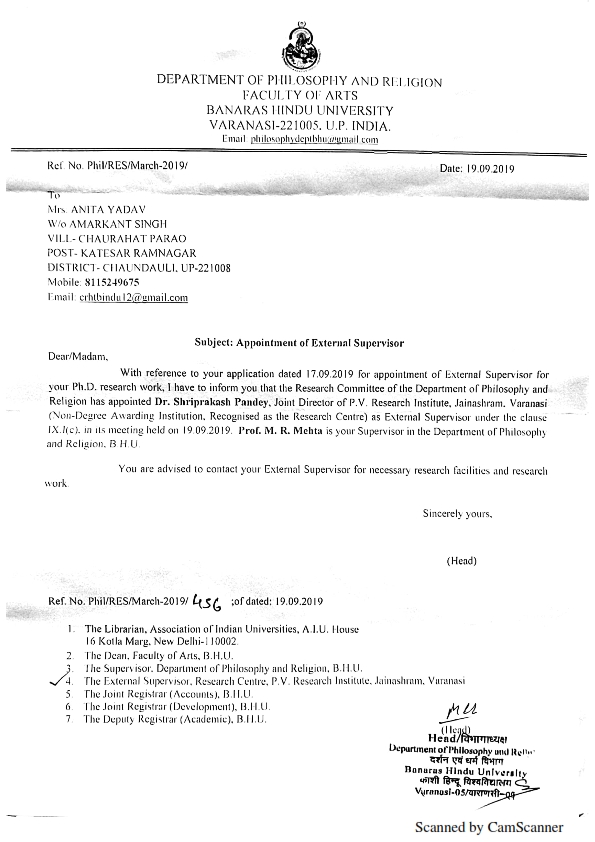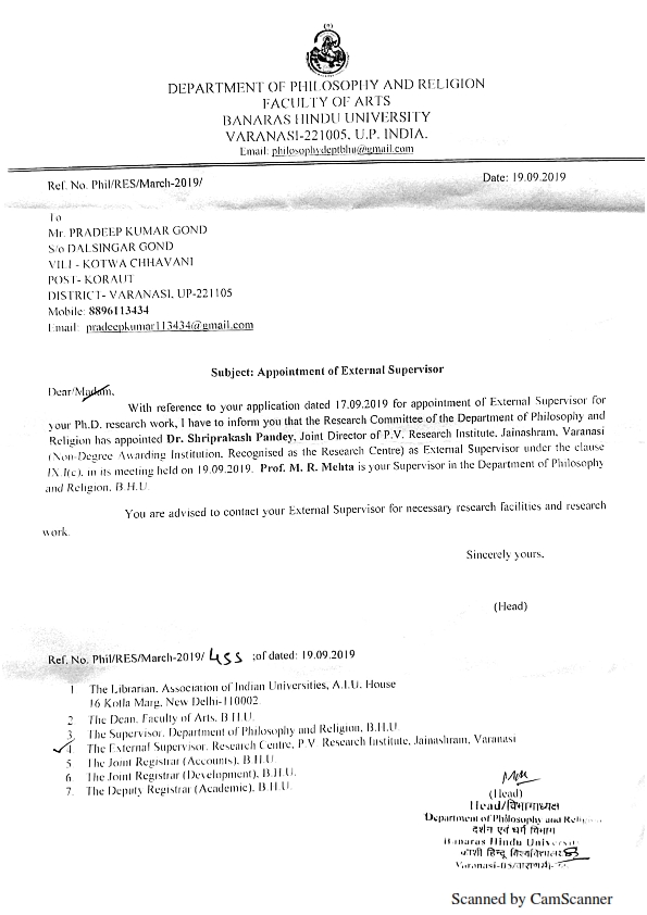 After a long gap of 19 years, again Research work from BHU has been resumed. Now the Research Scholars of the various departments of Faculty of Arts, BHU can be enrolled for their Ph.D. at Parshwanath Vidyapeeth, an external Research Center of B.H.U. Through a meeting of D.R.C. ( Departmental Research Committee ), Department of Philosophy, BHU held on 19/09/2019, two Research Scholars got enrolled under Supervision of Dr. S. P. Pandey, Joint Director, Parshwanath Vidyapeeth. Dr. Pandey will work as external Supervisor. Now the Research Scholars from other departments like Department of A.I.H.C. & Archaeology, Hindi, Sanskrit, Jain Bauddha Darshan (SVDV) will be able to get registered under faculty of Parshwanath Vidyapeeth for their Ph.D. Research.