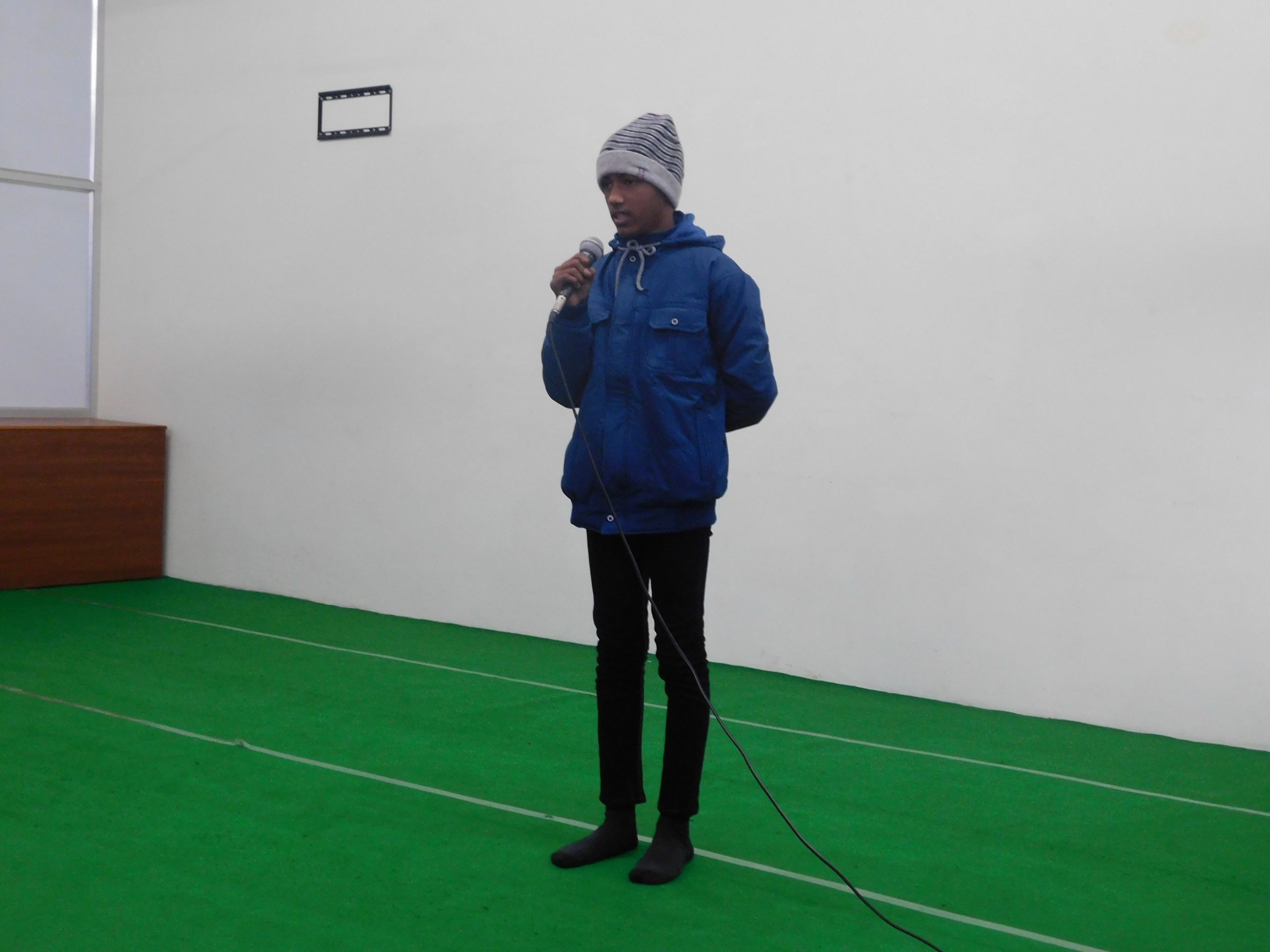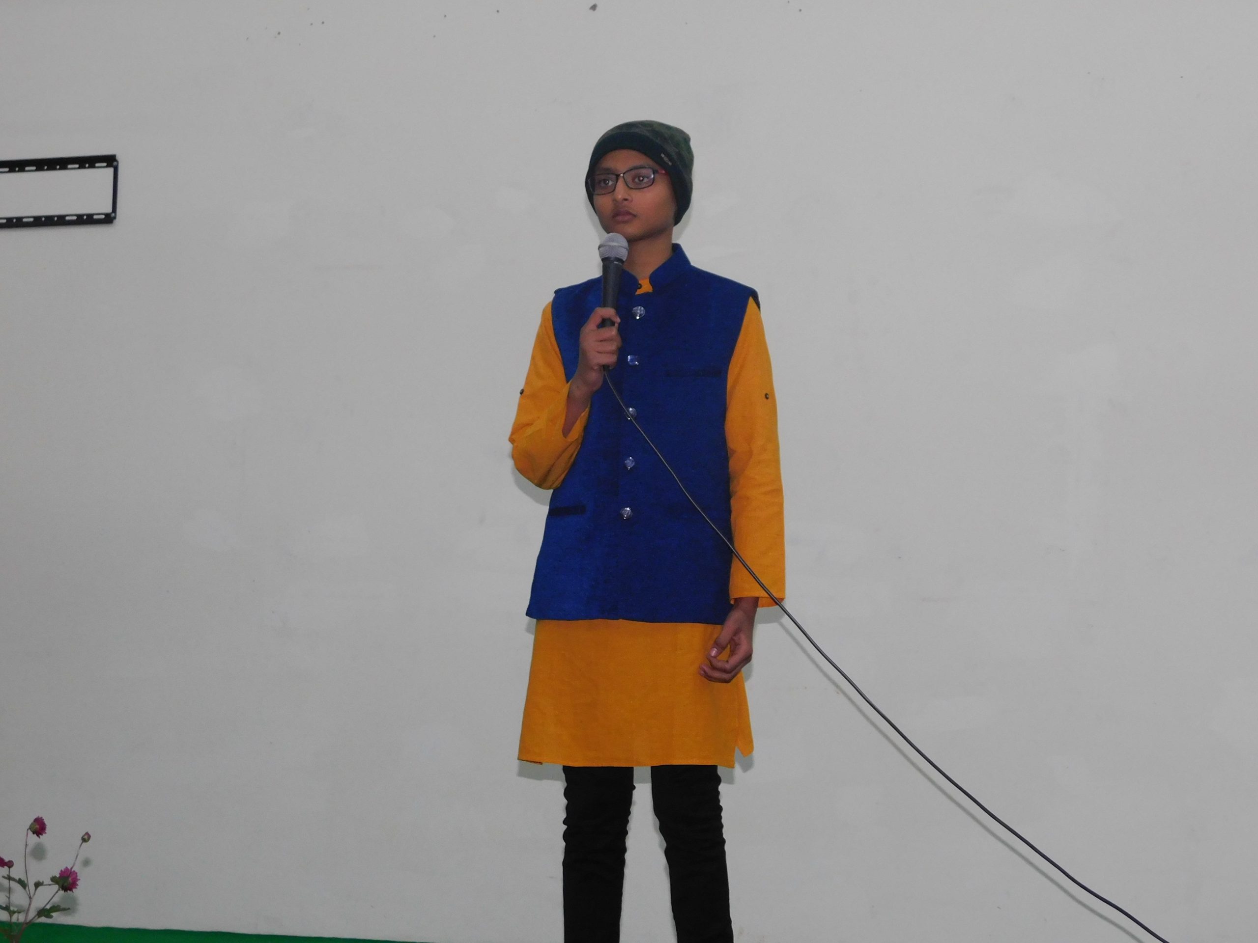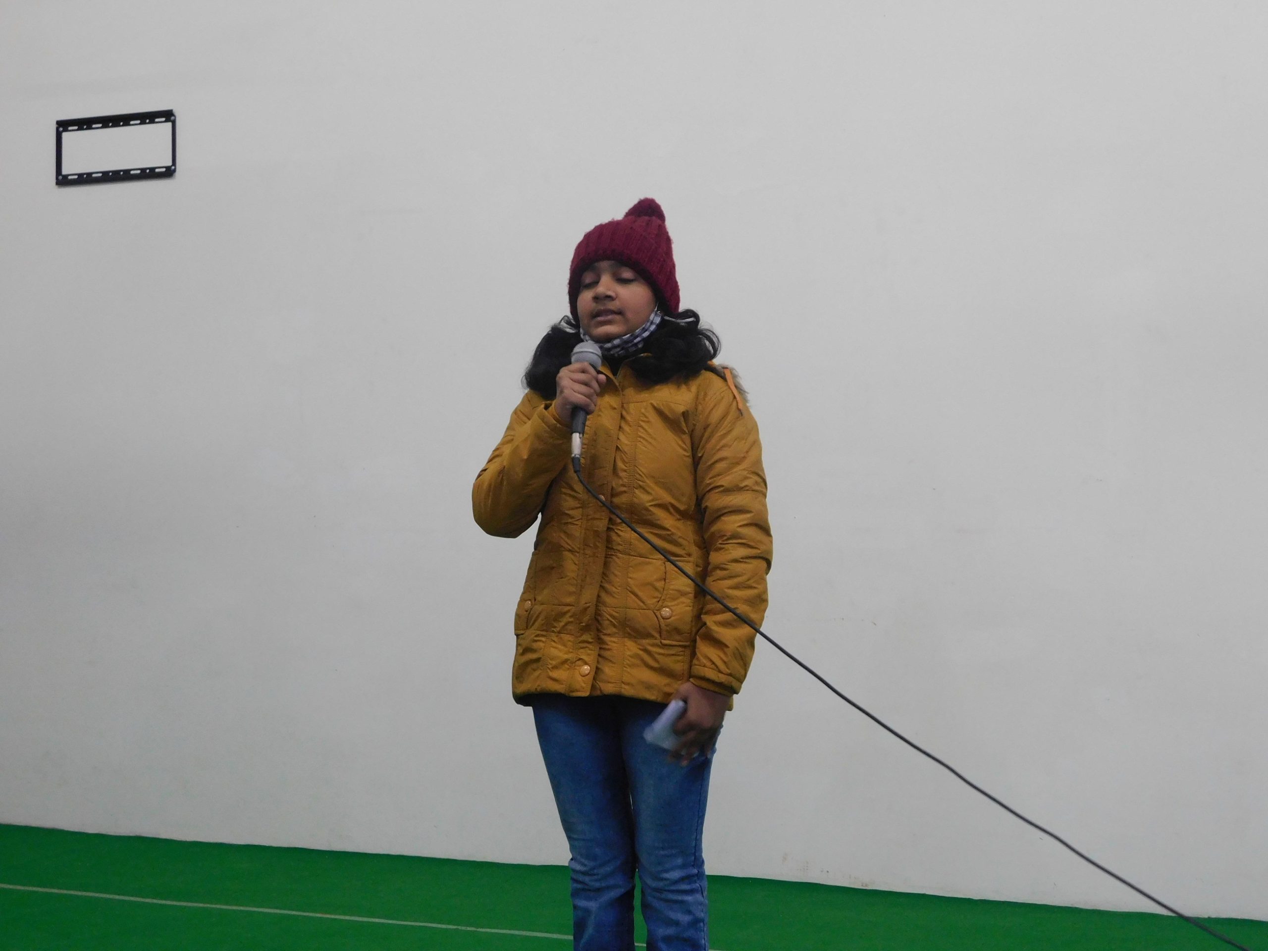 A young participant leads singing of National Anthem.